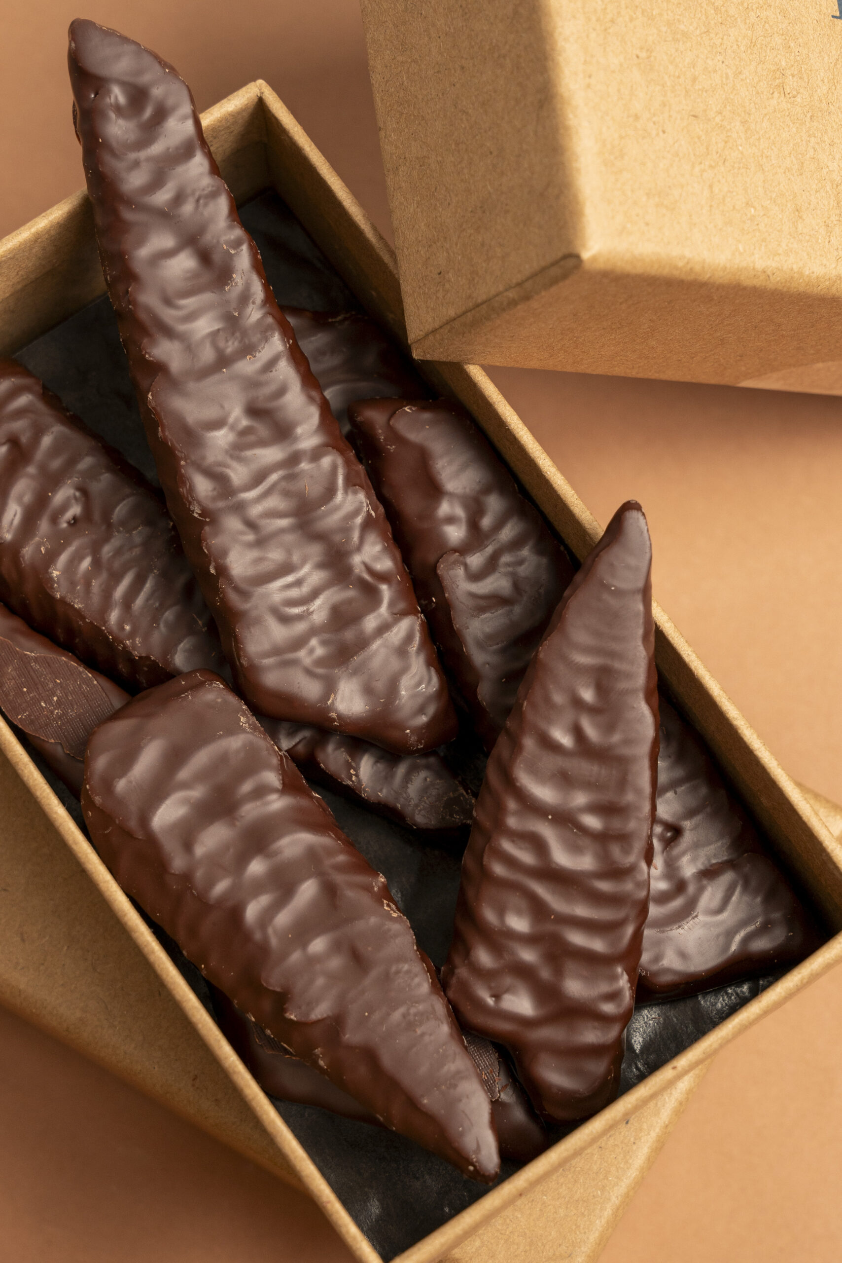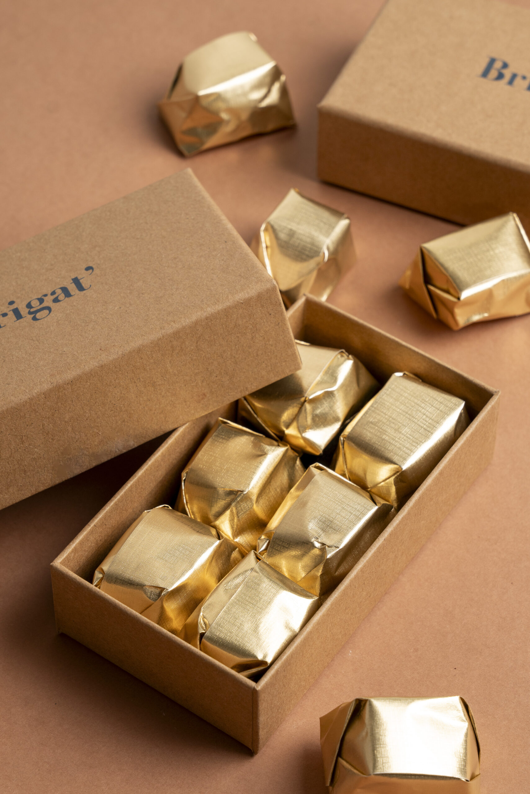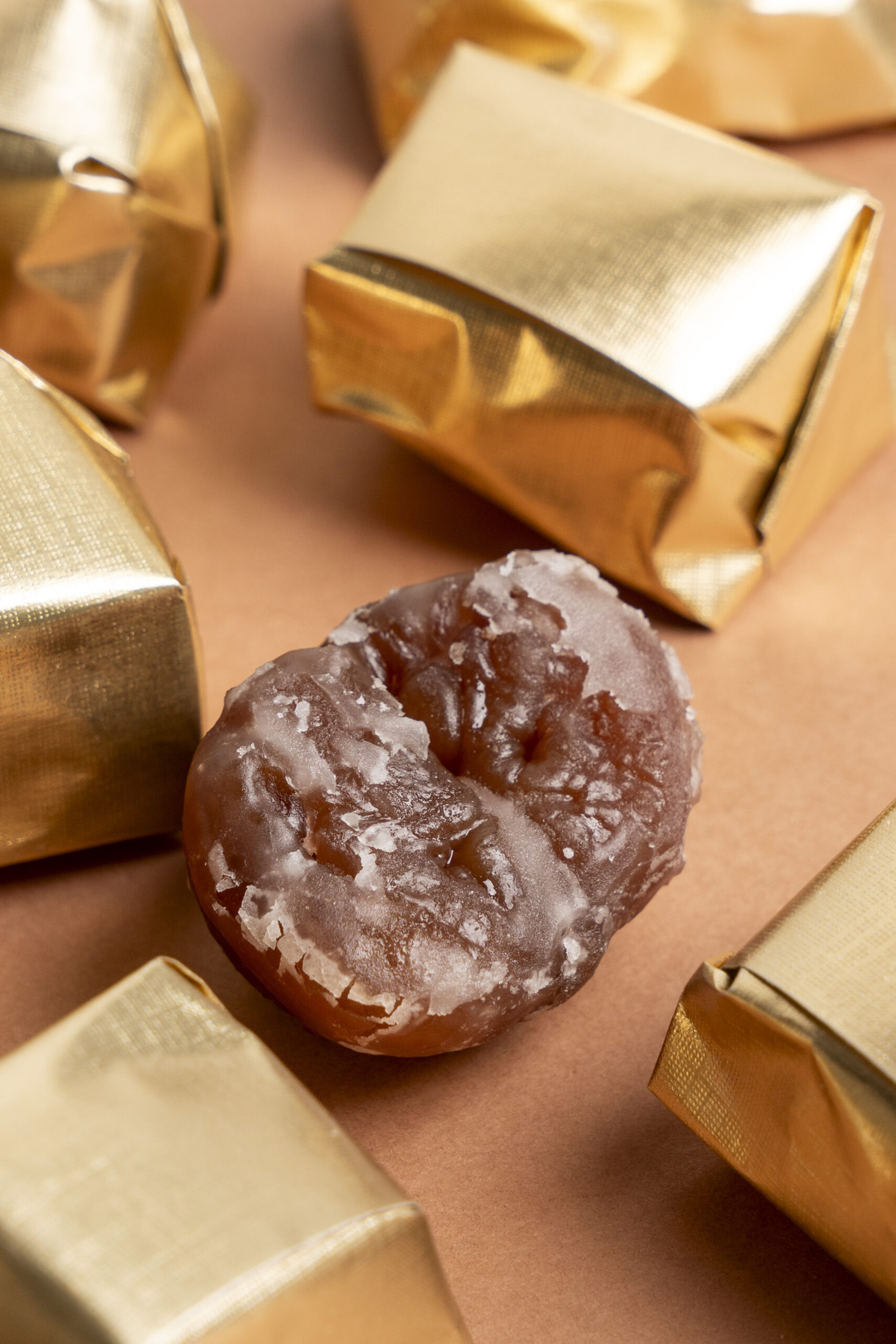 Un coffret de six marrons d’Ardèche, immergés dans l’eau durant 8 jours avant d’être emmaillotés, puis cuits à l’eau et baignés dans un sirop dans lequel des fagots de gousses de vanille vont diffuser leurs arômes durant 48h. Pour parfaire l’équilibre des saveurs, les marrons reposent ensuite une semaine dans leur sirop de confisage