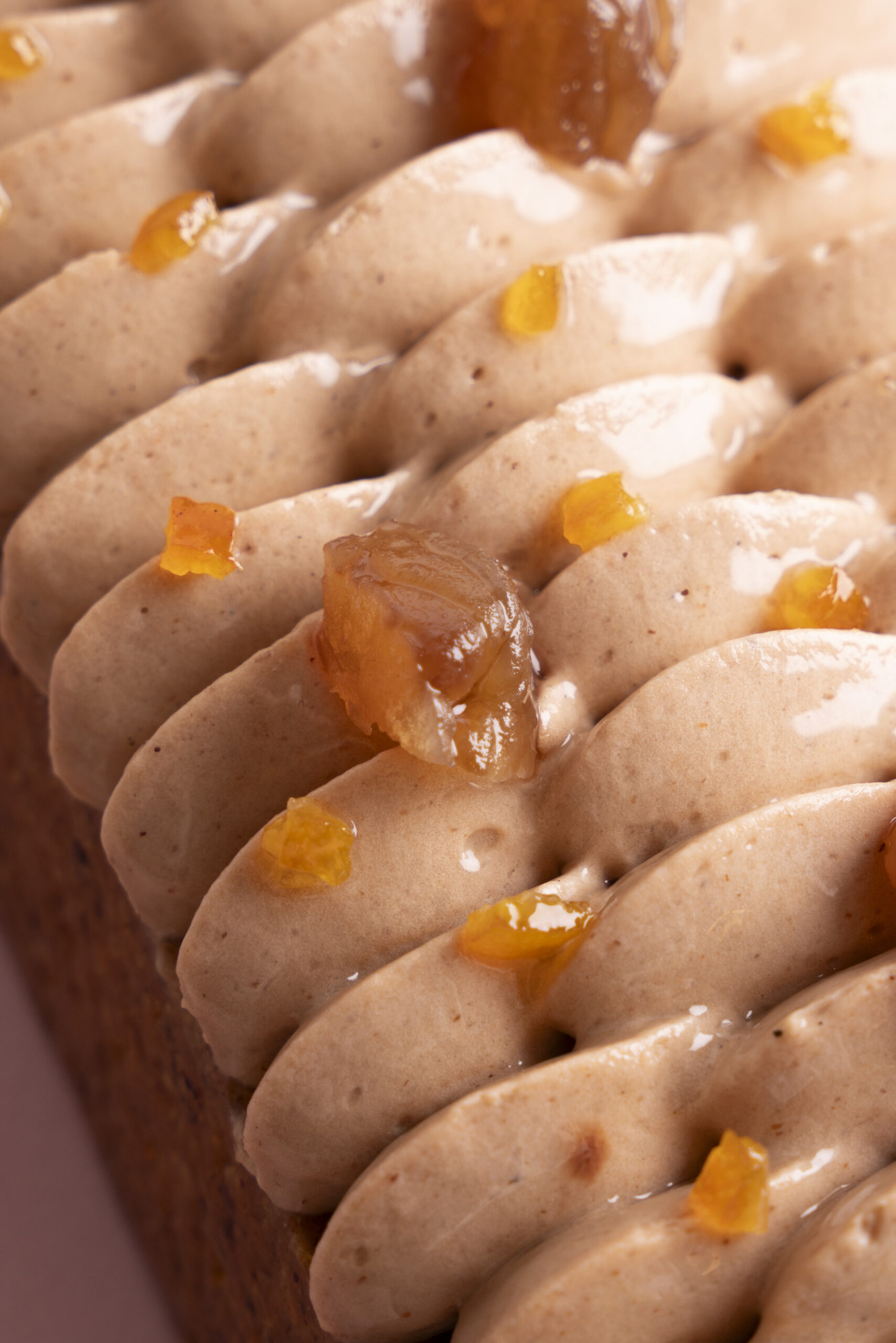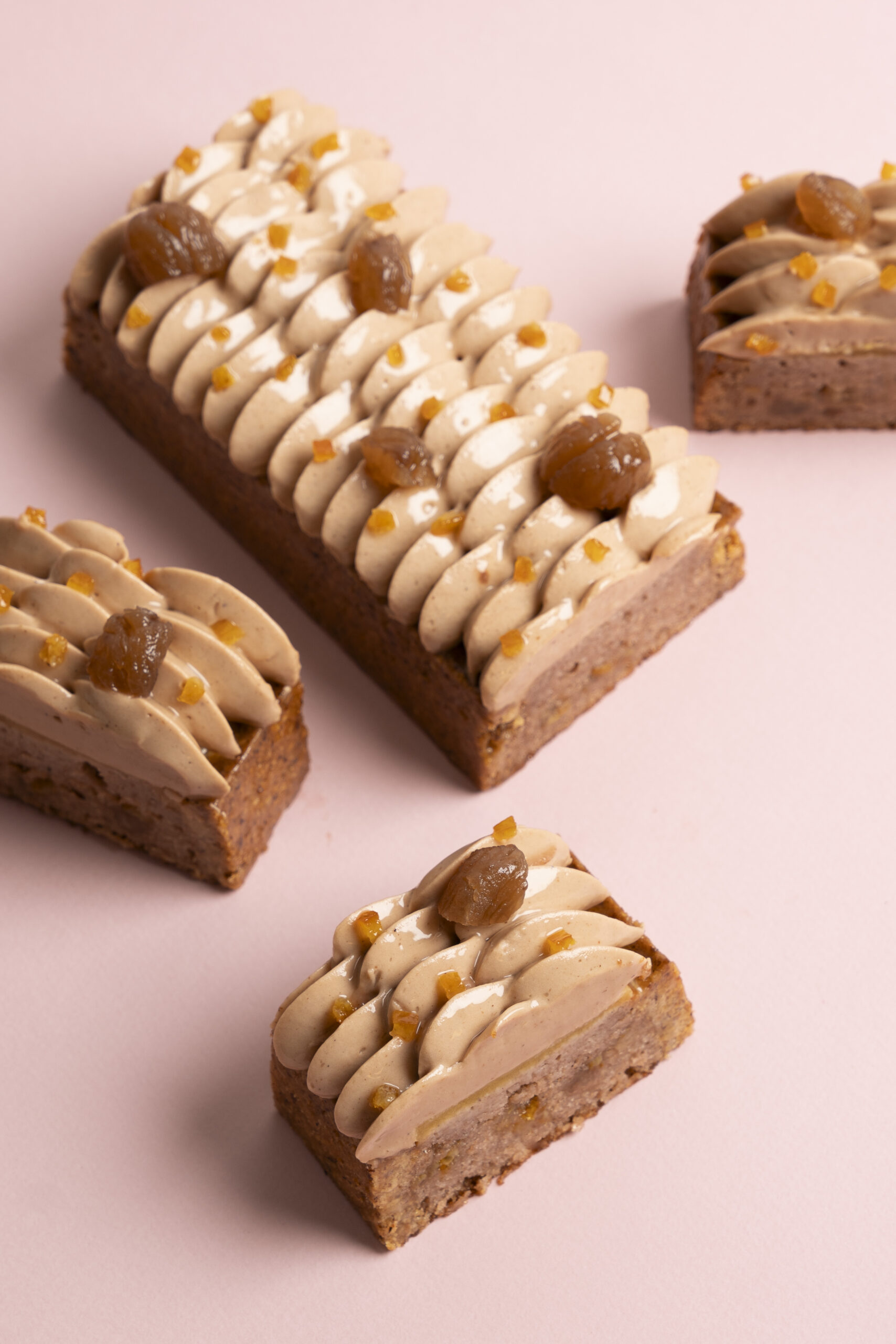 Entouré d’un crumble à la noisette torréfiée, retrouvez un cake à la châtaigne et mandarine confite. L’acidité de la mandarine dynamise l’ensemble et apporte des notes florale à chaque bouchée.