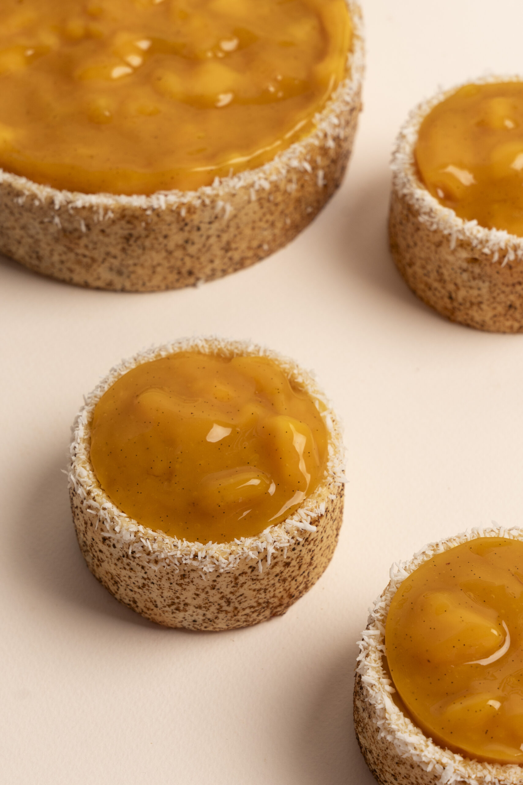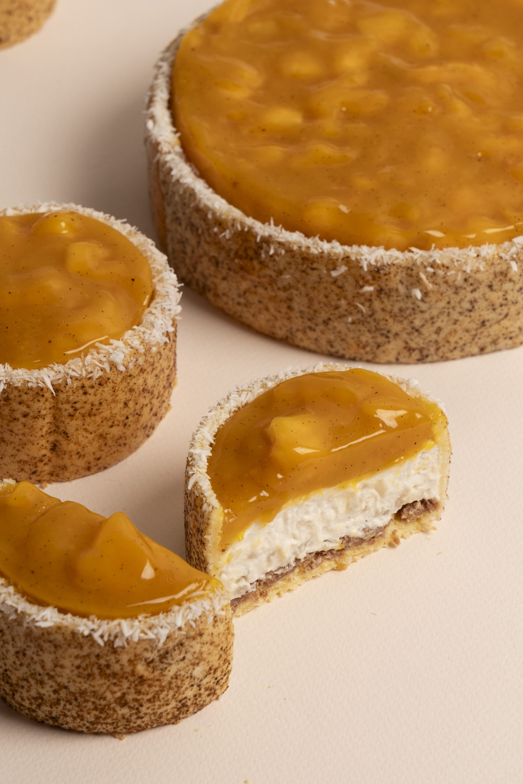 Biscuit cuillère à la vanille, praliné croustillant, ganache montée riz au lait et noix de coco, compotée et morceaux de mangues fraîches