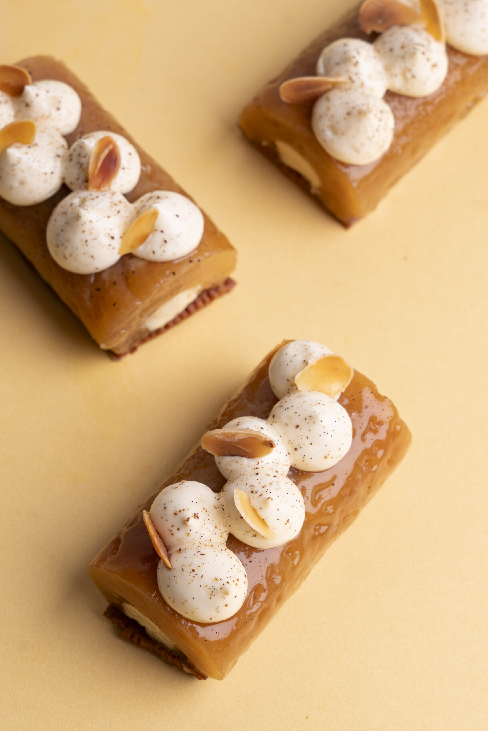 Comme une revisite de la tarte tatin, retrouvez des morceaux de pommes fondantes et légèrement caramélisées entourant un crémeux au calvados. Une crème légère à la crème d’Issigny pour son côté réconfortant et une pâte à croissant caramélisé pour son croustillant viennent parfaire le tout.
