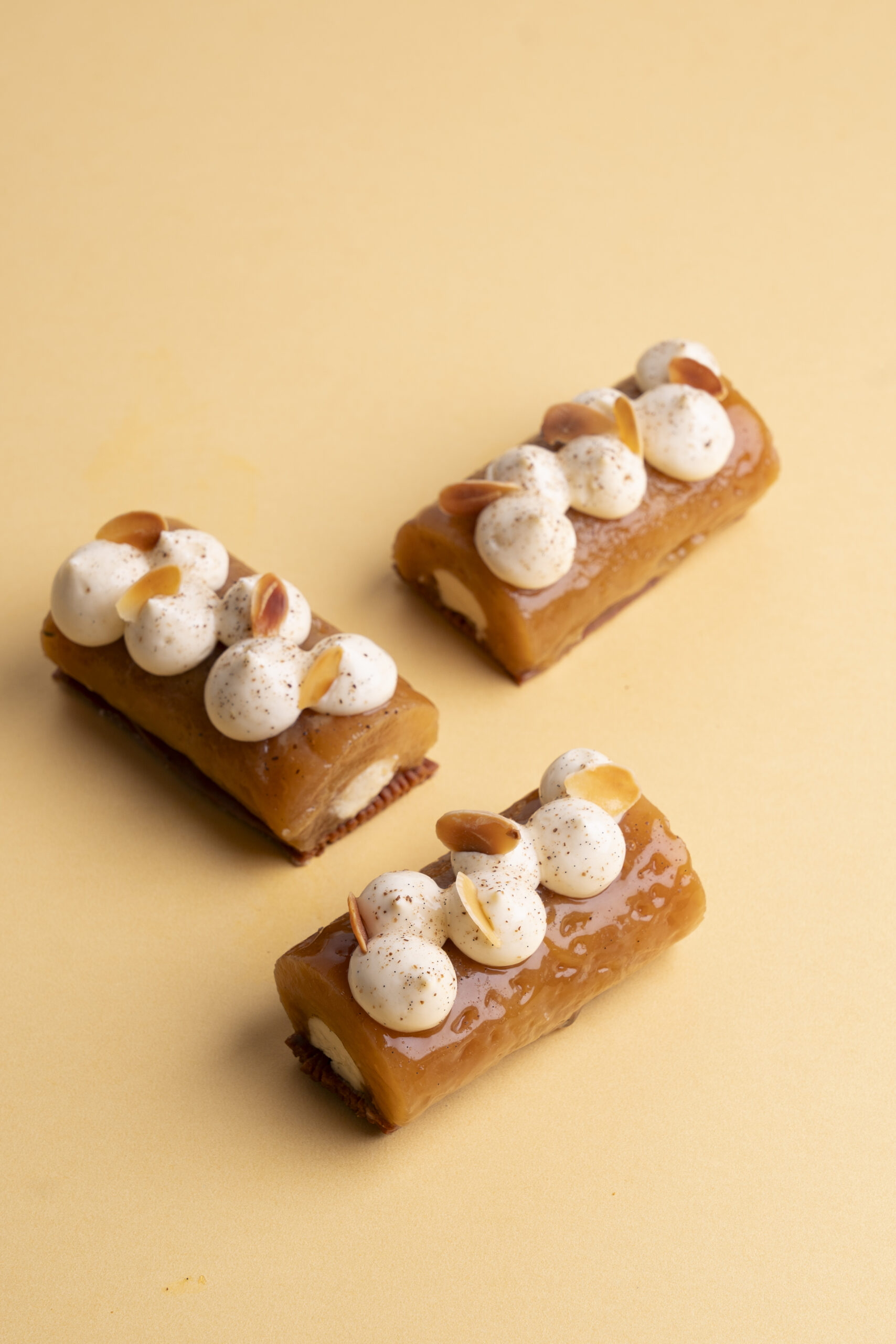 Pâte à croissant caramélisée, pommes fondantes, crémeux au calvados, crème légère à la crème d’Issigny