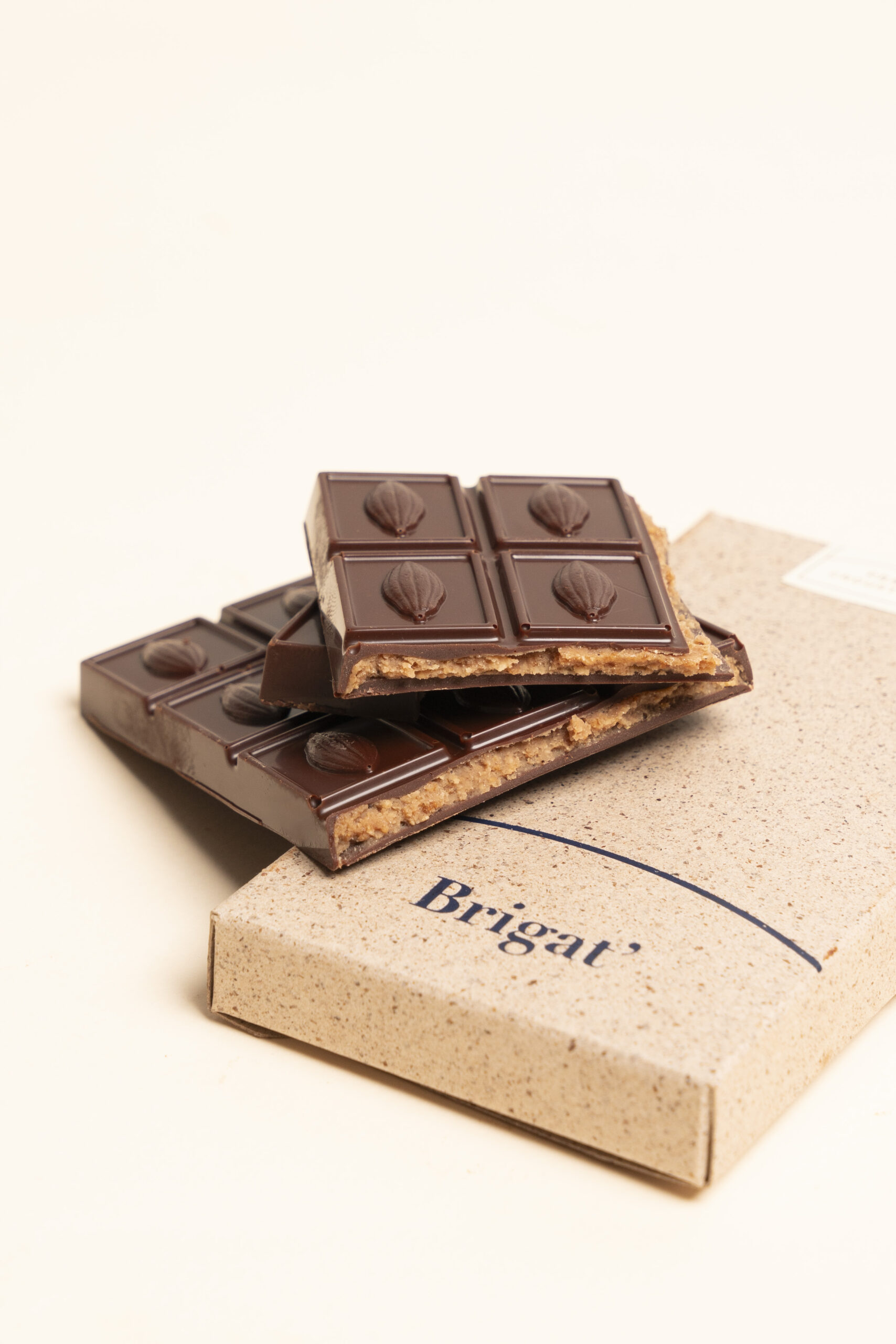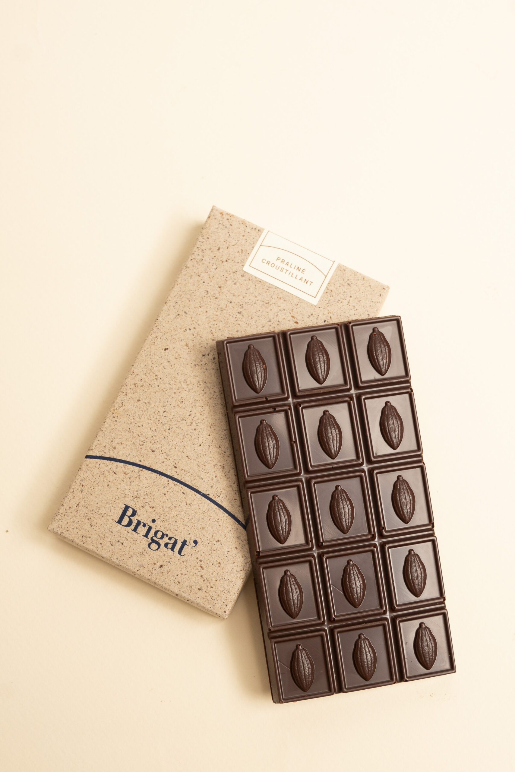 Une tablette fourrée d’un praliné noisette croustillant, enrobage chocolat noir 70% cacao origine Pérou