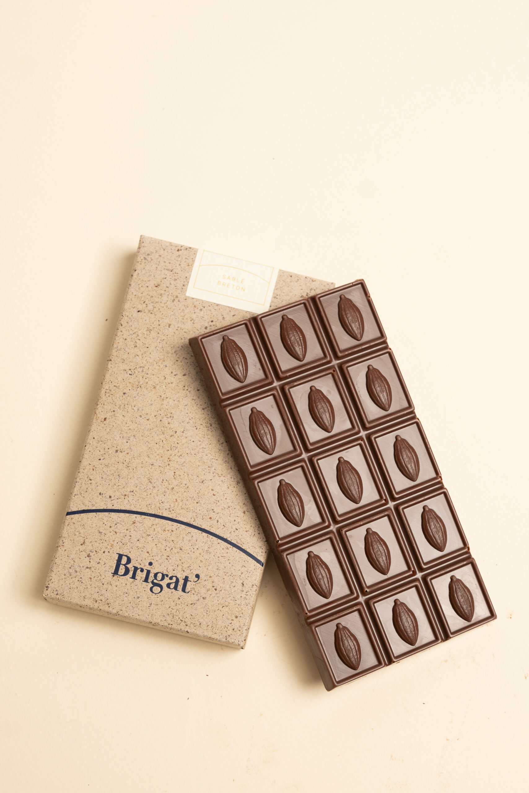 Une tablette fourrée pâte à tartiner au biscuit sablé, éclats de sablés Bretons, noisettes Françaises, enrobage chocolat au lait 40% origine Pérou